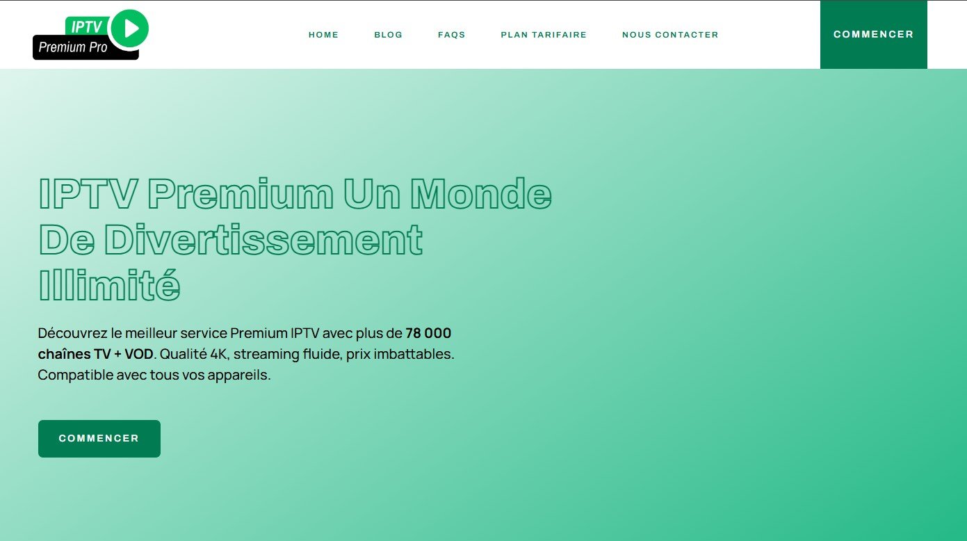 iptv-premium-pro.com se présente comme une solution IPTV ambitieuse, revendiquant un catalogue de plus de 78 000 chaînes en direct et une vaste bibliothèque de vidéos à la demande (VOD), disponibles en qualité HD et 4K. Ce service met l’accent sur une expérience utilisateur simplifiée, une compatibilité multi-appareils et des tarifs abordables, allant de 19 € pour trois mois à 139 € pour 24 mois. Avec des serveurs promettant une stabilité optimale, un support client 24/7 et une garantie de remboursement de 30 jours, IPTV Premium Pro cherche à séduire un large public.
